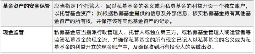 5. 现金监管——私募基金应当指派行政管理人、托管人或独立第三方,或私募基金管理人或运营者等监管私募基金的现金流,并做好管理工作。